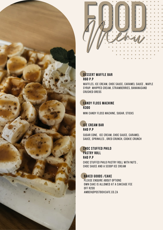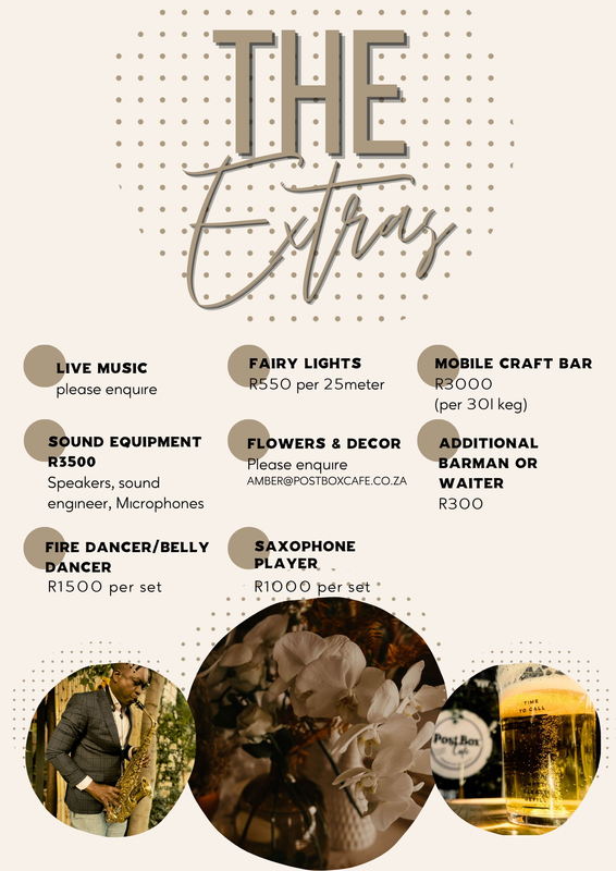 Got a special event in mind? We've got just the venue to help you tailor that memorable occasion. Enquire about our functions package : amber@postboxcafe.co,za